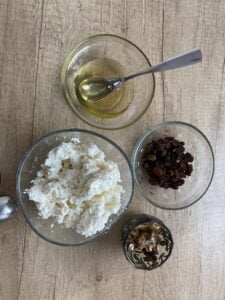 Astăzi vă prezint cea mai rapidă gustare sănătoasă: brânză cu miere nuci și stafide potrivită atât pentru copii(mai mari) cât și pentru adulți.