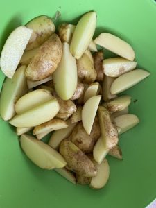 - Spălăm, curățăm și uscăm cartofii noi, apoi îi condimentăm cu sare, piper, boia dulce.