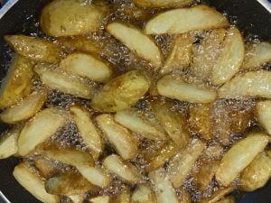 - Într-o tigaie cu ulei preîncălzit, punem cartofii la prăjit în baie de ulei.Dacă preferați cartofii la cuptor, vedeți rețeta de cartofi wedges aici