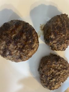 - Preîncălzim grătarul sau tigaia și coacem burgerii 4 minute pe fiecare parte plus încă 4 minute i-am ținut cu un clește să se coacă și pe lateral( asta pentru că am vrut carnea foarte bine făcută).