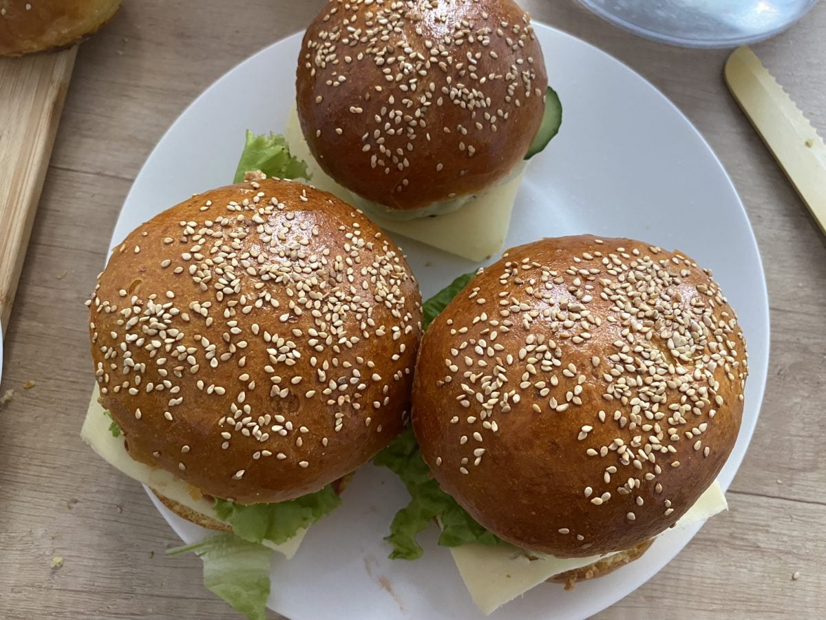 - Pentru copilul nostru am pus doar chifla, burgerul și castravete. Voi adaptati, după cum le știți preferințele