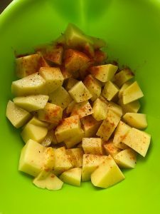 - Am spălat cartofii, i-am uscat cu un servețel de hârtie, i-am tăiat cuburi potrivite ca dimensiune. Am preîncălzit cuptorul la 180 grade, funcția sus-jos plus ventilație.