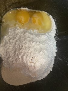 - În cuva mașinii de frământat sau într-un vas, puneți făina, drojdia și ouăle