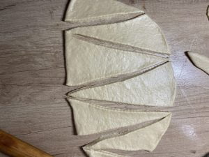 - Întindem o foaie de aluat de grosimea unui deget mic și cu un feliator de pizza, formăm triunghiuri