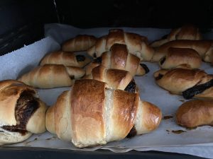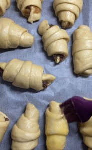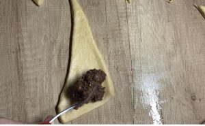 - Fiecare triunghi se va umple cu o linguriță de magiun la bază, apoi se va rula, cu grijă, dinspre bază spre vârf.Când le puneți în tavă, aveți grijă ca vârful să fie sub corn, să nu se desfacă la copt.Vezi video mai jos.