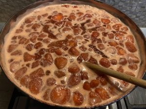 • Când începe fierberea, (cam 30 de minute a durat până să înceapă clocotul), amestecăm constant, din când în când pentru că se va umfla și există riscul să curgă din vas. De aceea este important să fie suficient de înalt vasul.