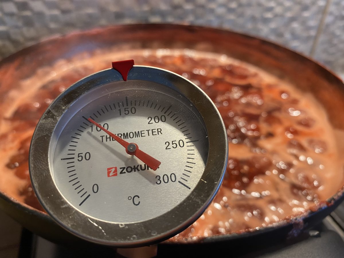 • După 50 de minute de fierbere, am oprit gătirea. Siropul era trecut foarte puțin peste 100 de grade. Gemul ideal se obține la temperatura de 105 grade.