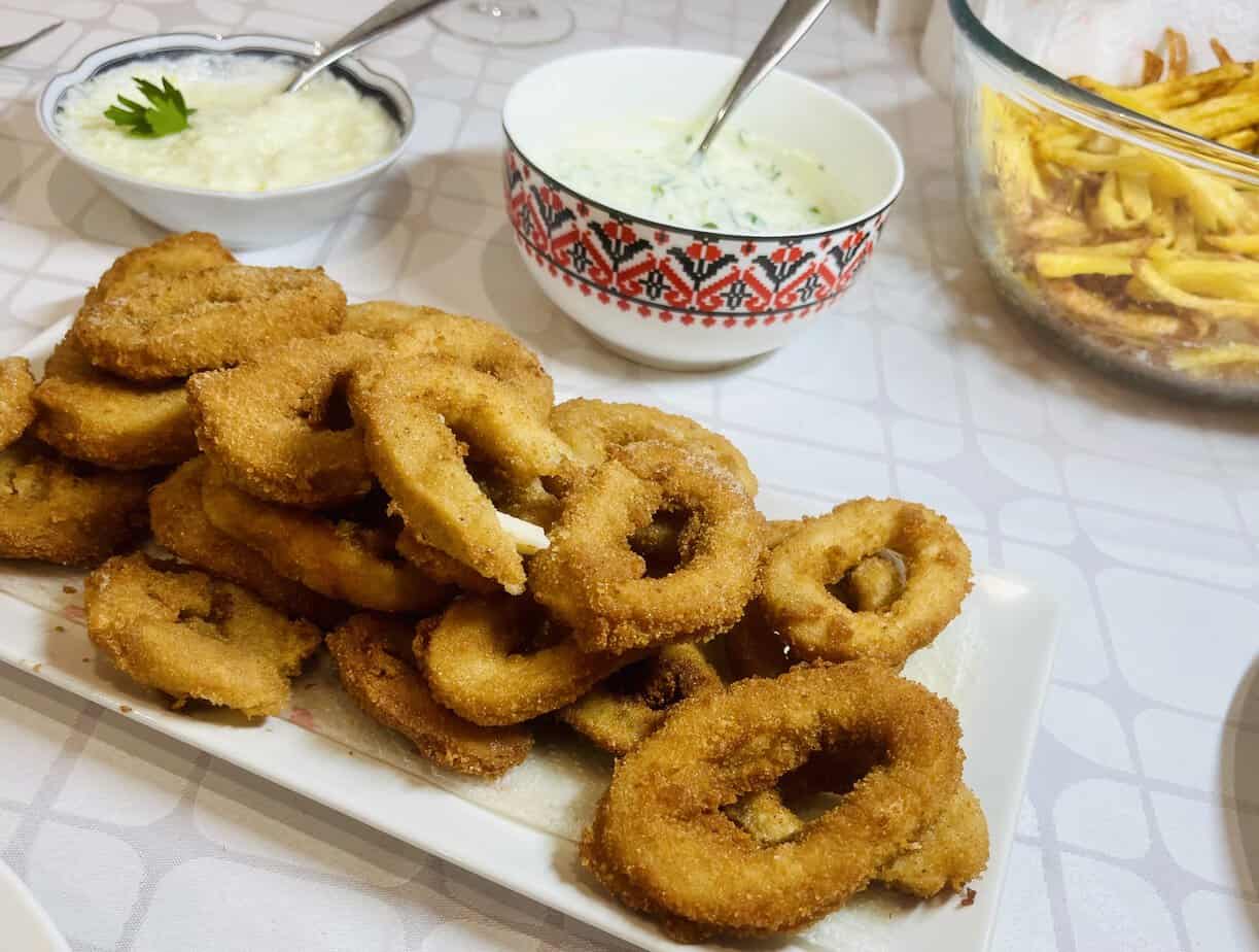 - Apoi fiecare inel de calamar va fi trecut prin: făină, ou, pespet. Vezi în video mai jos cum am făcut. Procedăm așa cu toate inelele de calamar.
