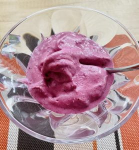 - Într-un blender, punem toate îngredientele: fructele, smântâna, laptele praf și mixăm până obținem o cremă densă, similară cu cea de înghețată artizanală.