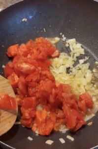 - Apoi tocăm și roșiile și le adăugăm peste ceapă. Gătim acest amestec pentru aproximativ 10 minute.