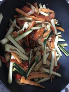 - Tăiem și morcovul și ardeiul și dovlecelul fâșii și le adăugăm exact în această ordine: întâi morcovul, apoi ardeiul și ultimul dovlecelul sau zucchini.