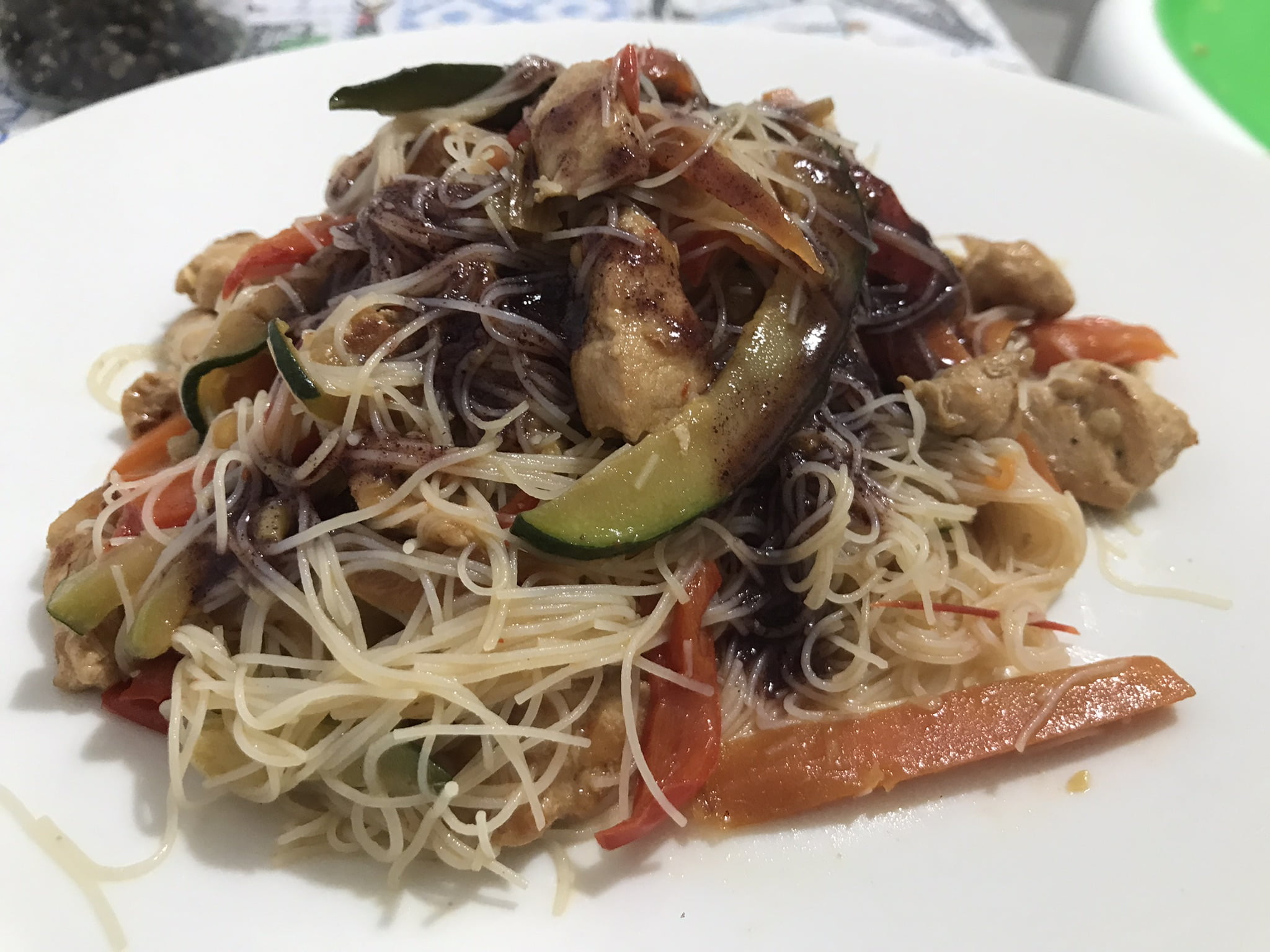- Între timp pregătim pastele de orez conform intrucțiunilor de pe ambalaj. Ale mele nu au necesitat fierbere. A trebuit doar să le țin 5 minute în apă care a ajuns în punctul de fierbere, și pe care am luat-o de pe foc în acel moment.