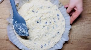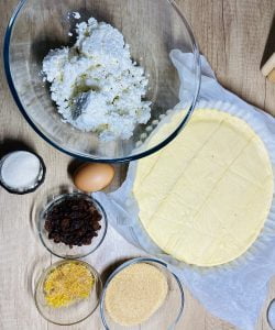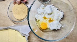 - Am pregătit umplutura. Într-un bol, am pus brânza, oul, zahărul, un praf de sare, grișul, stafidele, aromele și am amestecat totul.