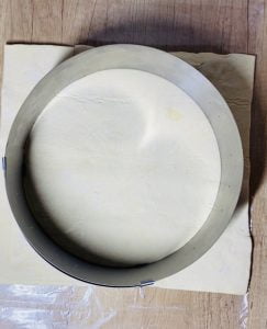 - Am pus cele două foi de aluat una peste alta și cu ajutorul unei forme rotunde cu diametrul de 24 cm, am decupat aluatul.