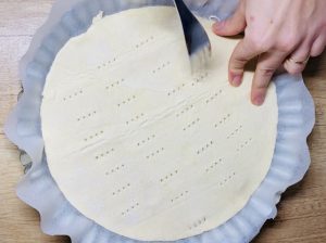 - Am pus o foaie de aluat decupată în tava tapetată cu hârtie de copt și am înțepat-o din loc în loc cu furculița.