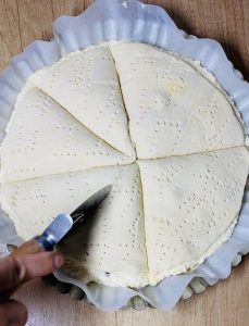 - Apoi am pus celalalt aluat, cu grija, peste amestecul de brânză. Apoi am feliat în 8 felii, cu ajutorul unui feliator de pizza.