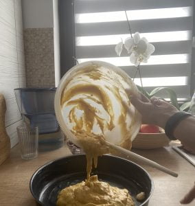 - Într-o tavă tapetată cu hârtie de copt, sau unsă cu unt, punem aluatul de prăjitură și îl nivelăm cu o paletă de silicon sau cu ce vă este la îndemână.