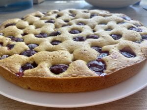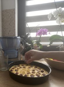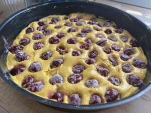 - Preîncălzim cuptorul la 180 grade sus-jos. Adăugăm apoi vișinele. Presați-le puțin cu degetul, să se afunde un pic.