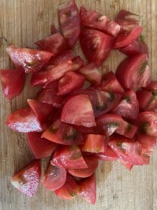 - Spălați, uscați și tăiați roșiile