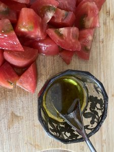 - Pregătin un dessing din 5 lingurițe de ulei de măsline, 1 linguriță de oțet balasamic, sare și piper