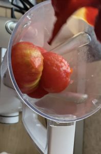 - Punem într-un blender roșiile decojite. Dacă nu aveți un blender, puteți să tocați cât mai mărunt toate ingredientele cu ajutorul unui cuțit.