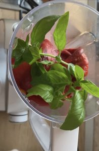 - Adăugăm ardeii copți, busuiocul, usturoiul și un pic de ulei de măsline.