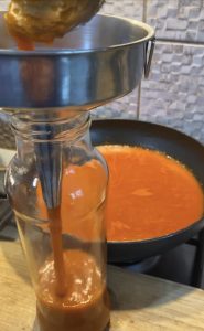- Apoi, când sosul era gata, am scos borcanele încă fierbinți de la sterilizat și cu ajutorul unei mănuși cu protecție termică, am pus cu grijă sosul în borcane.