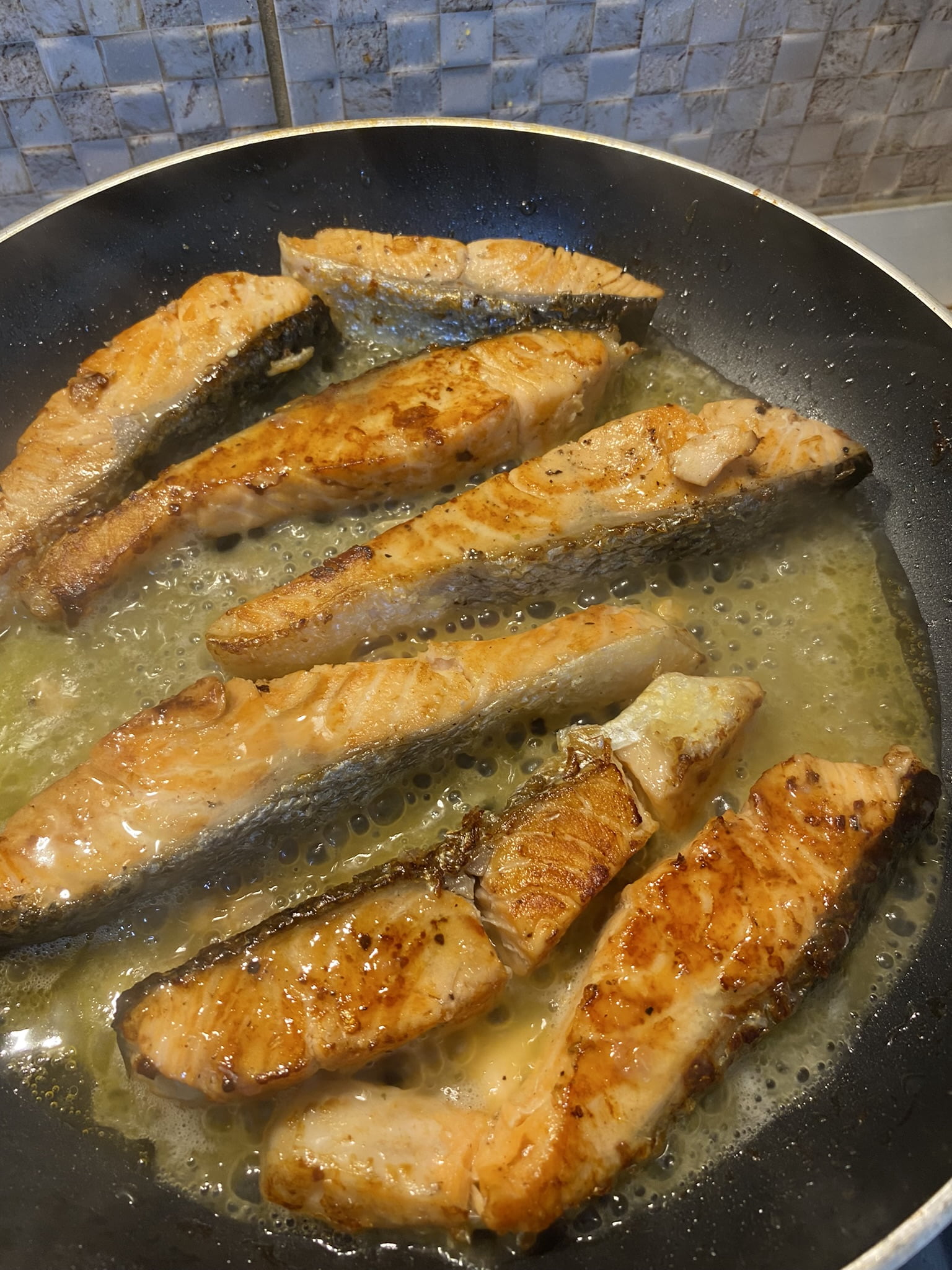 Când fileurile sunt bine rumenite pe toate părțile, adăugăm sosul de lămâie cu unt și mai lăsăm maxim 4 minute să scadă puțin sosul.