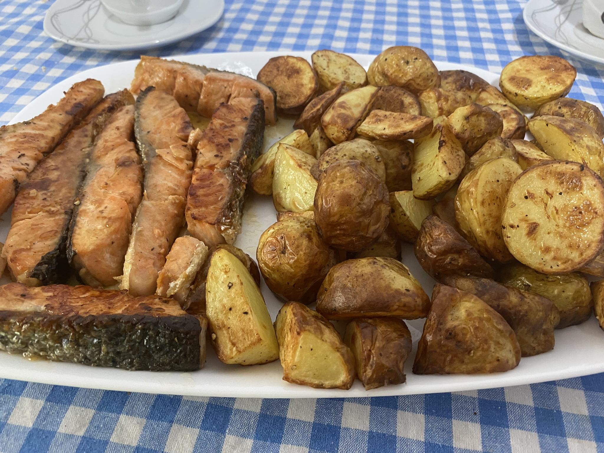 După 30 minute, cartofii erau gata, la fel și somonul.