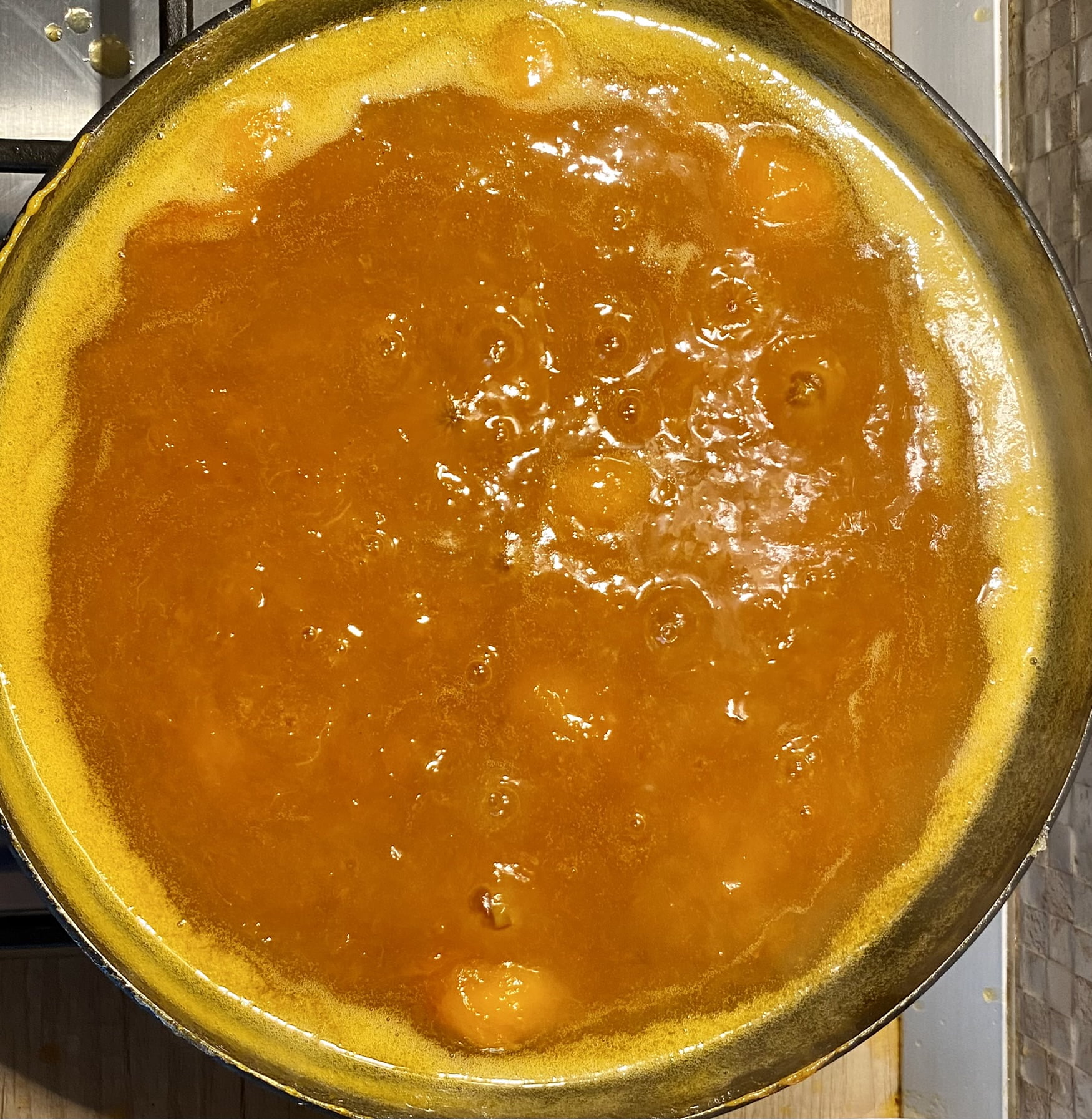 Adăugați zahărul peste caise și porniți flacăra/ plita. Eu am gătit la plită pe gaz, ochiul mediu, flacăra medie-mare.