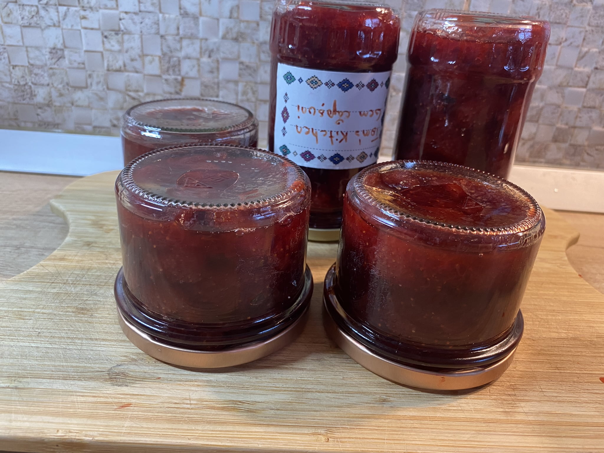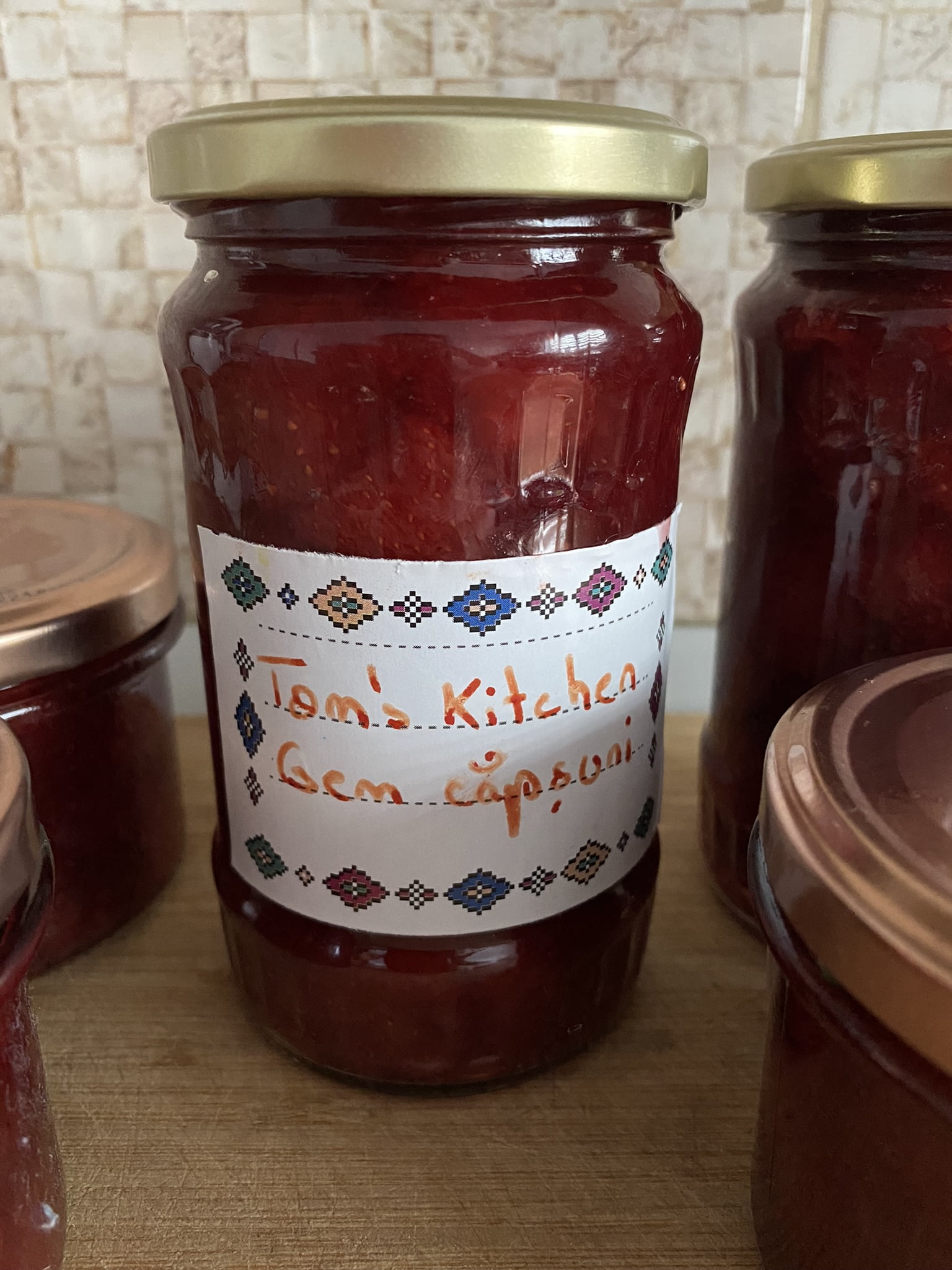 Am pregătit borcanele. Le-am pus în mașina de spălat vase la 70 grade. Când borcanele erau fierbinți, abia scoase din mașina de spălat, am început să pun și gemul care avea 90 de grade. Umpleți cu vârf borcanele. Am folosit mănuși de protecție. Fiți atenți să nu vă frigeți. Am pus imediat capacele și le-am întors cu capacul în jos. Rolul acestei întorceri este de sterilizare a capacului.