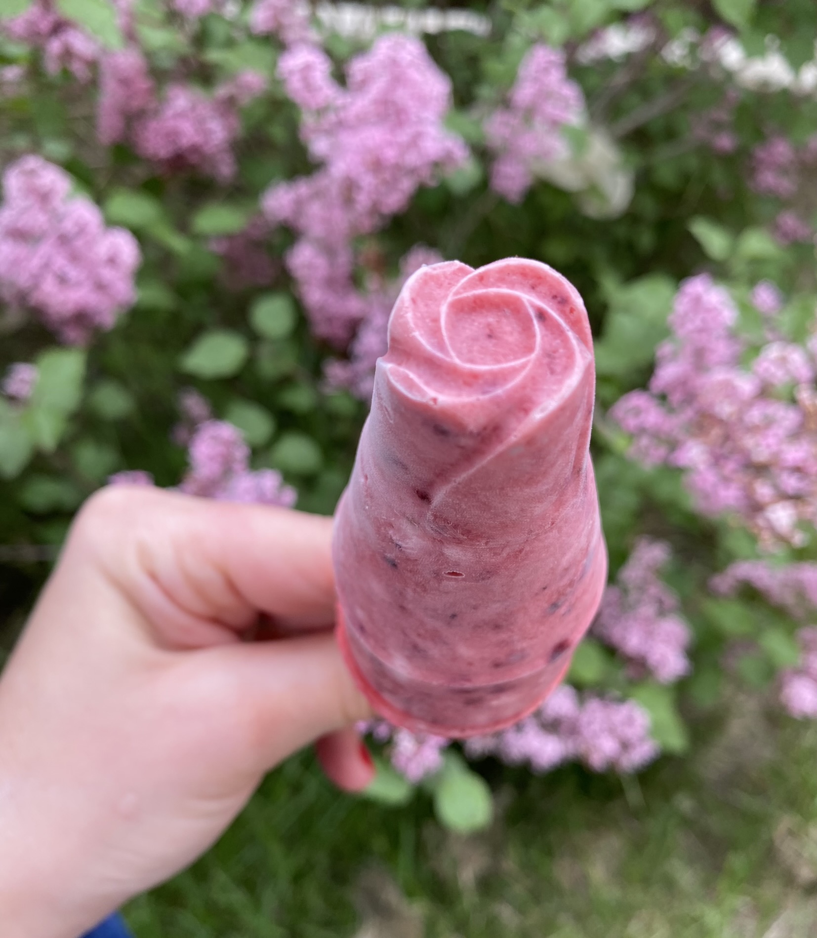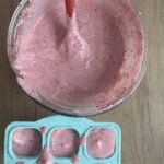 Punem înghețata în forme de silicon, cu ajutorul unui polonic mic. Restul de amestec care rămâne, poate fi pus într-o caserolă.