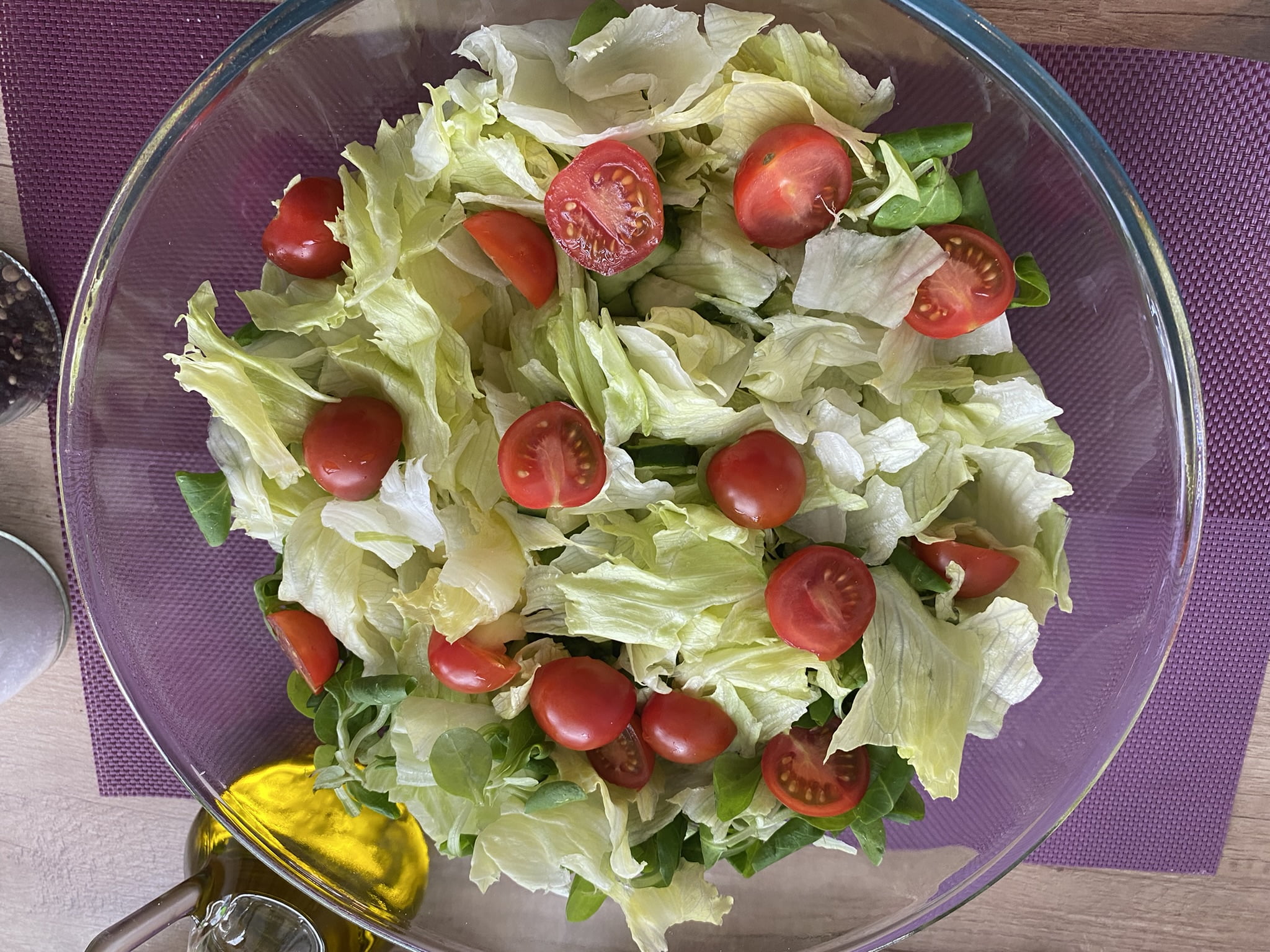 Facem o salată din mixul de salată iceberg și valeriană, câteva roșii cherry, 1 castravete și un ardei galben.